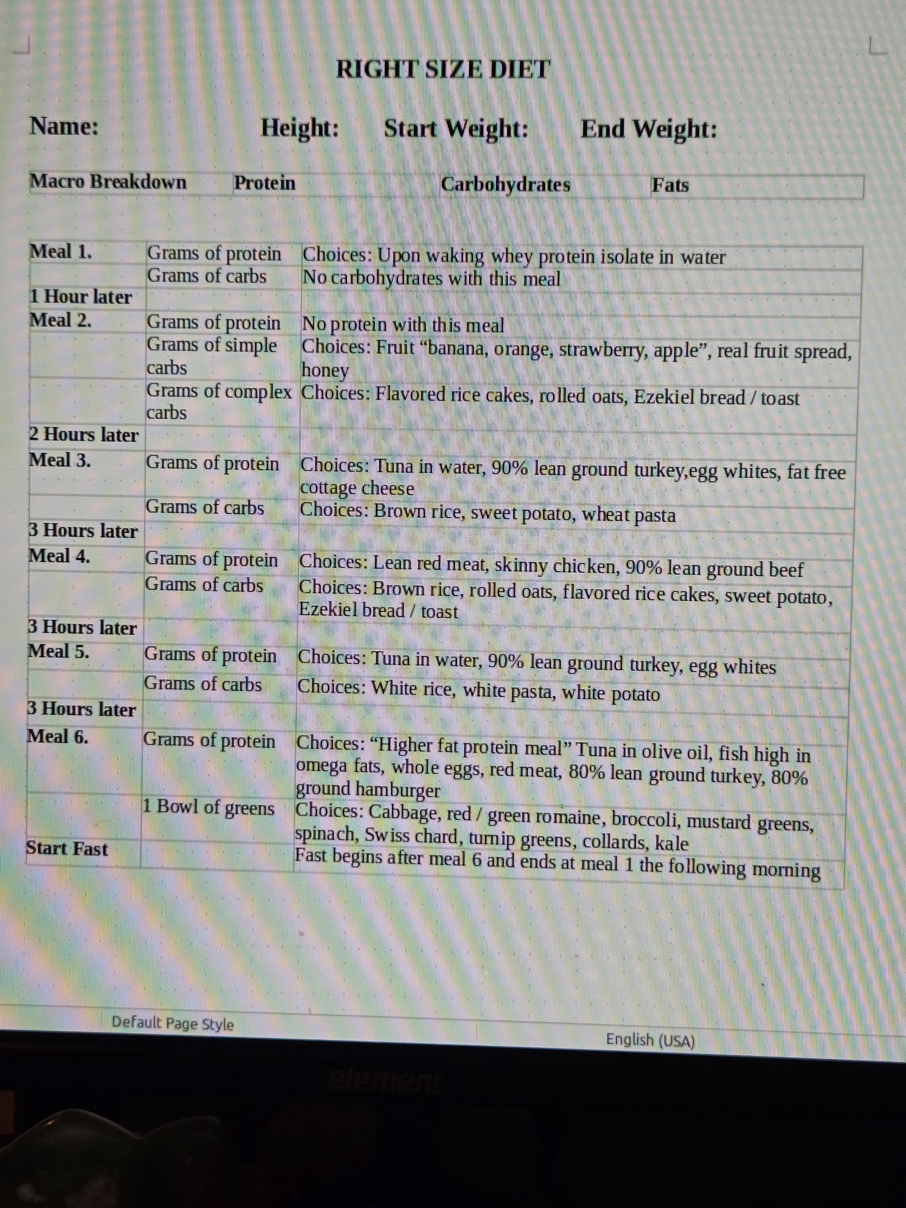 Attached below is the template to my Right Size Diet