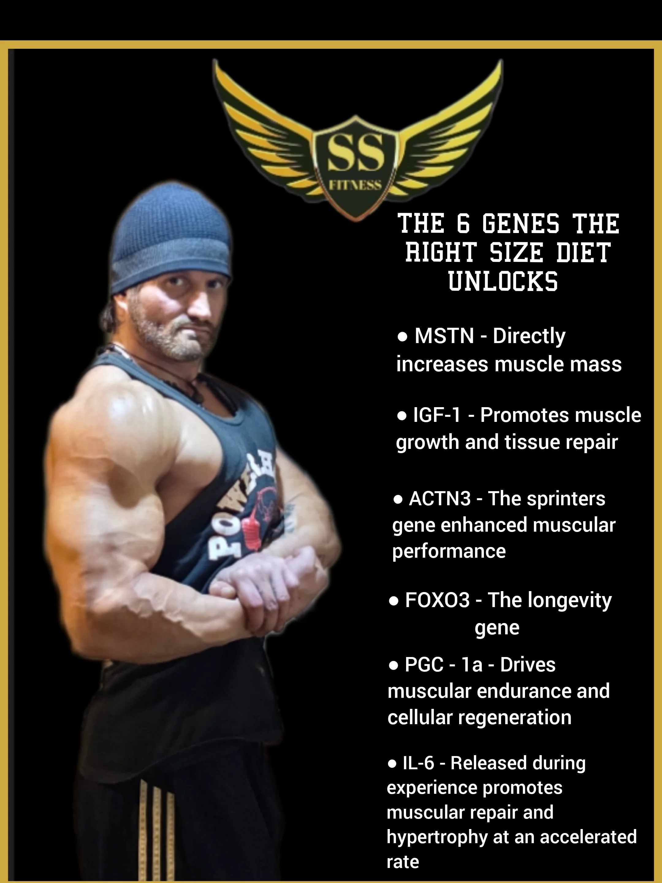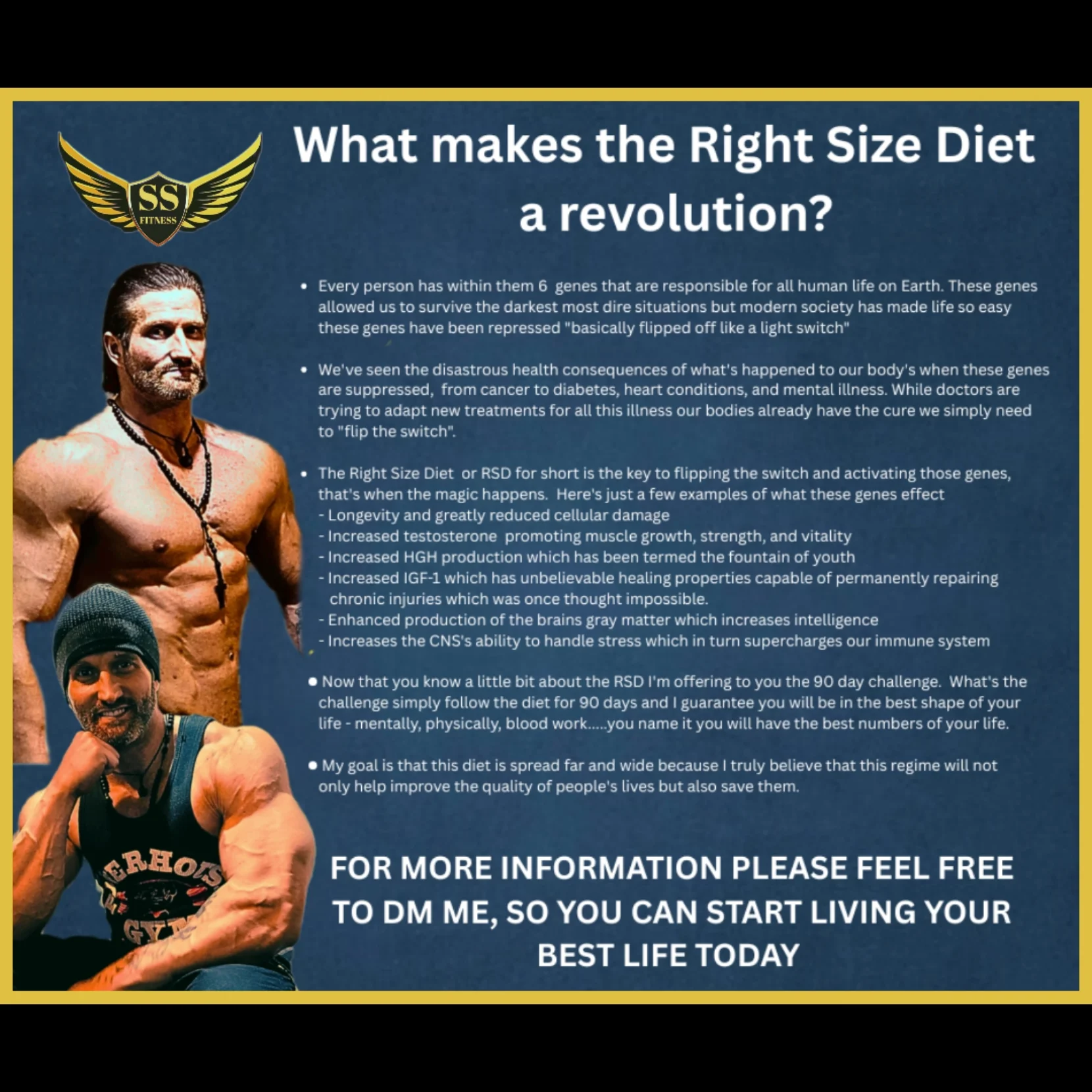 5'10 190lbs 42 years old, I trained consistently from 18 to 30 after that I didn't touch a weight for 12 years. 6 months ago I decided I was going to get back in shape so I could bring attention to the diet i created. When I was a personal trainer and prep coach I got to try my diet out on every possible body type and it always worked. The Right Size Diet mimics the circumstances necessarily to activate 6 repressed genes, those are the genes responsible for the human race surviving the darkest of time. So with our modern lifestyle of abundance those genes are repressed and in my opinion that's the reason men and women are suffering from low test, high levels of depression, chronic physical and mental illness.