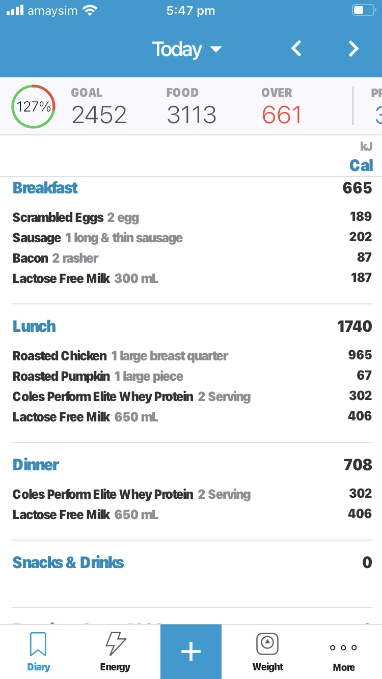 Even though my calorie goal is a deficit I still ate under that today, guts are really sore from yesterday so is very hard to eat now.