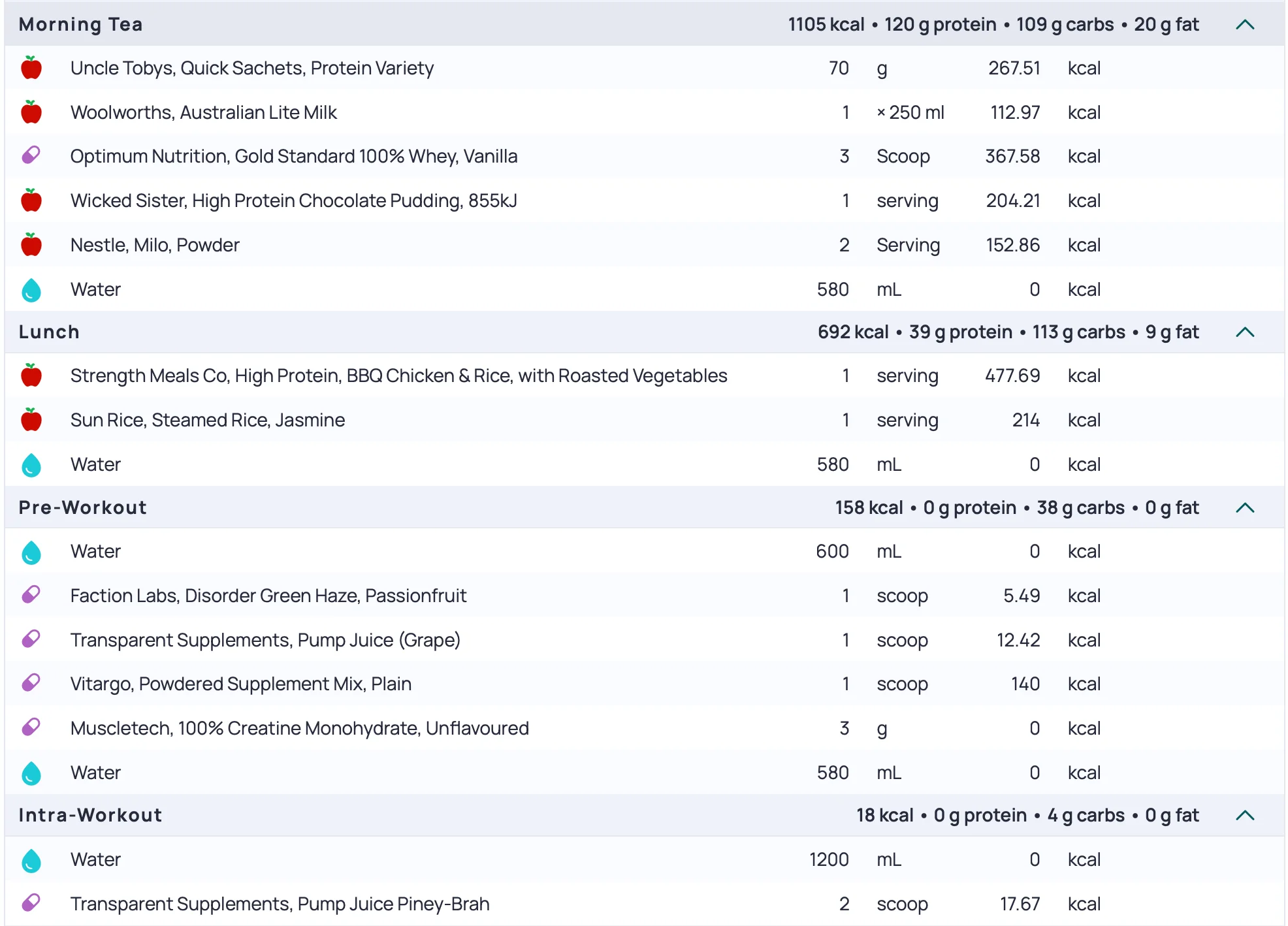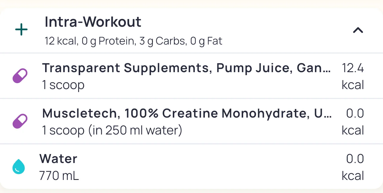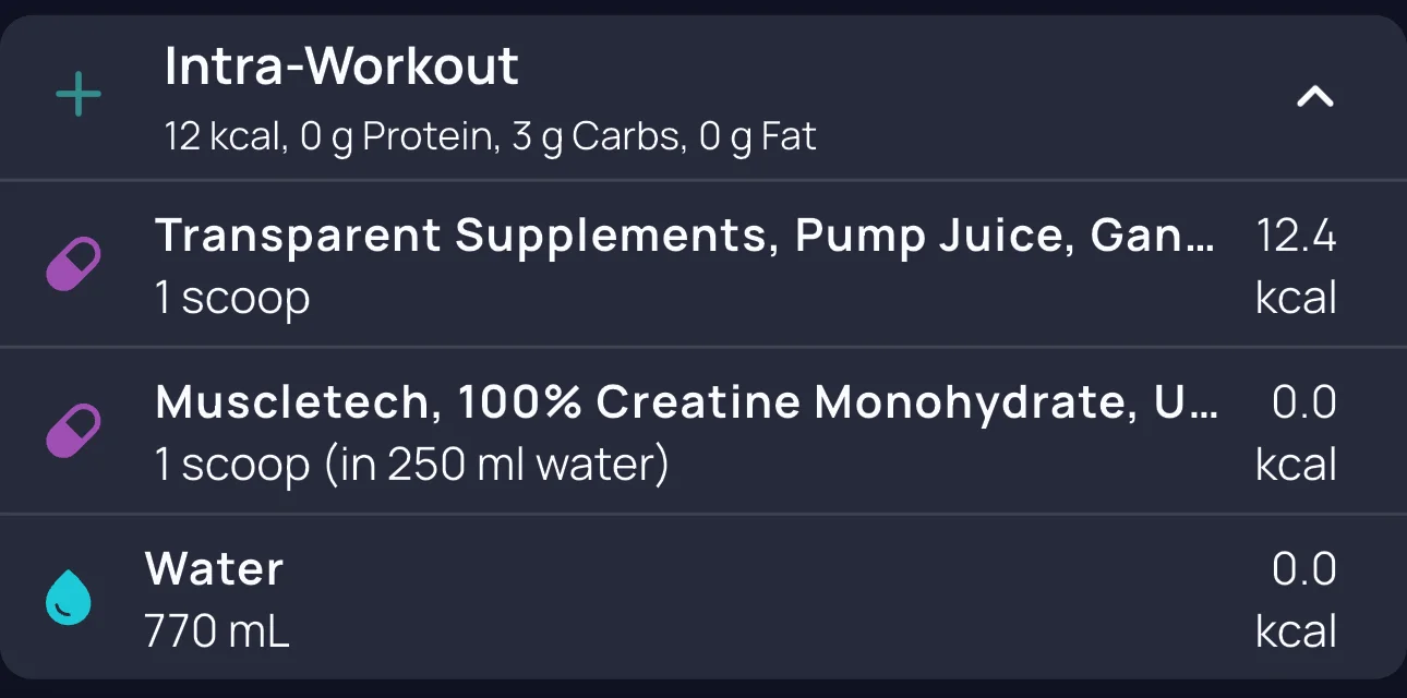 Pre and intra-workout nutrition attached. Used two cans of Oxyshred instead of Disorder, and while it gave a hit, it didn’t provide the usual energy or focus. Intra included water and pump juice, and hydration was solid throughout. Digestion is back on track after the weekend drop in intake.