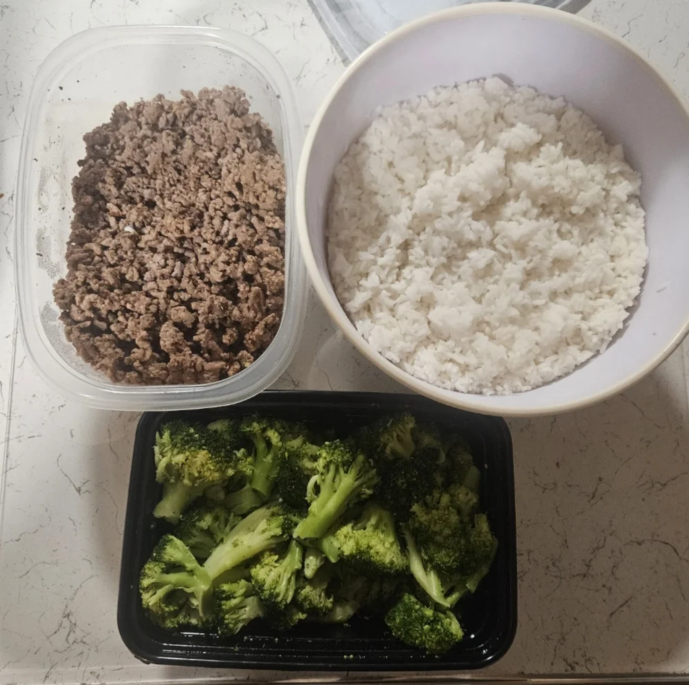 Dinner: Beef 150g, Rice 100g, Broccoli 120g, Olive Oil 5g | 471 kcal | P:44g | C:36g | F:17g | Fiber:4g | Sugar:1g