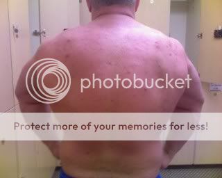 Yes, I figured Id post up a new pic of my back because it has been a long time... I have been doing alot of cardio and dieting so I have been braking out a little from the swett... Tell me what you guys think....