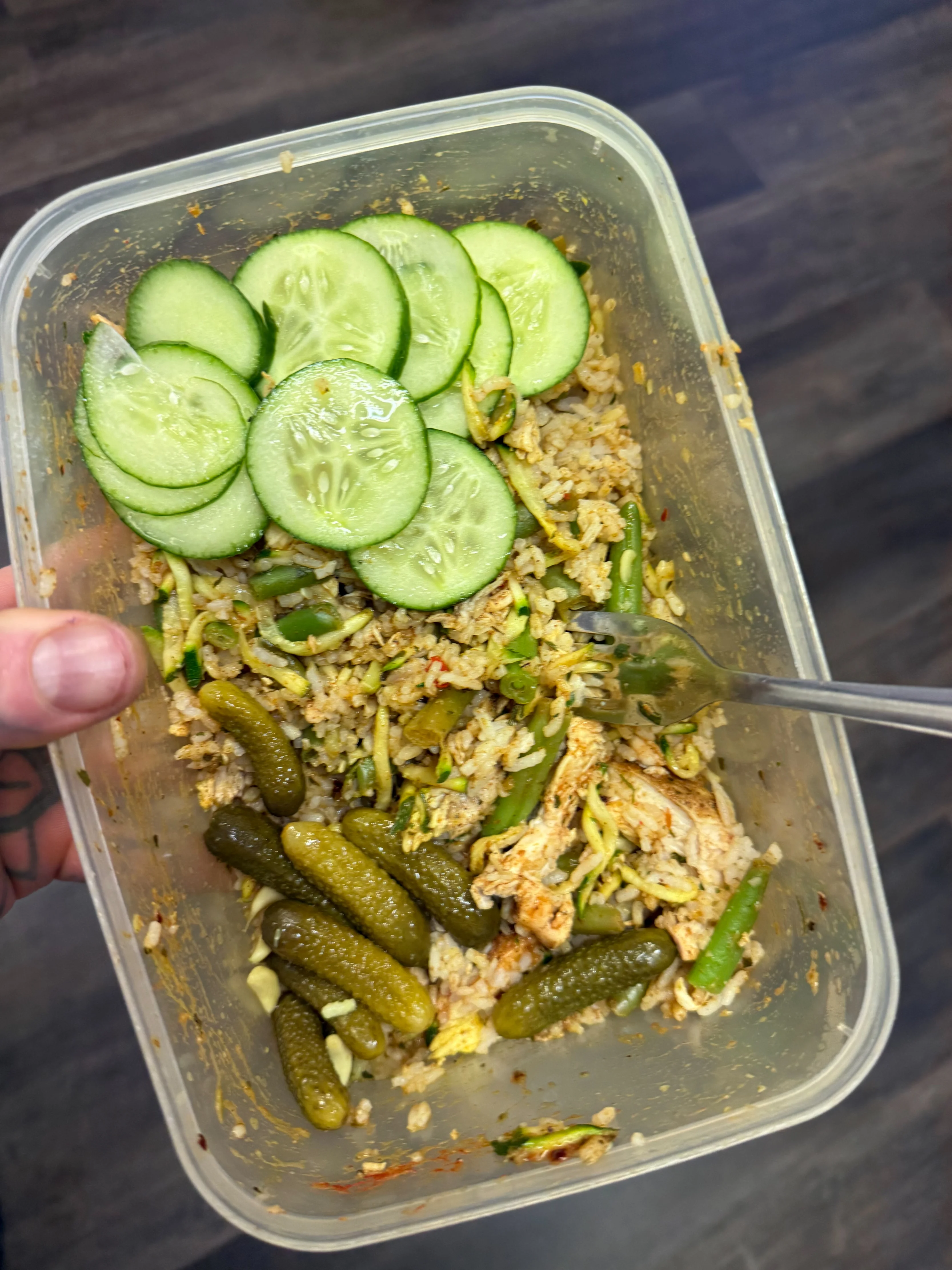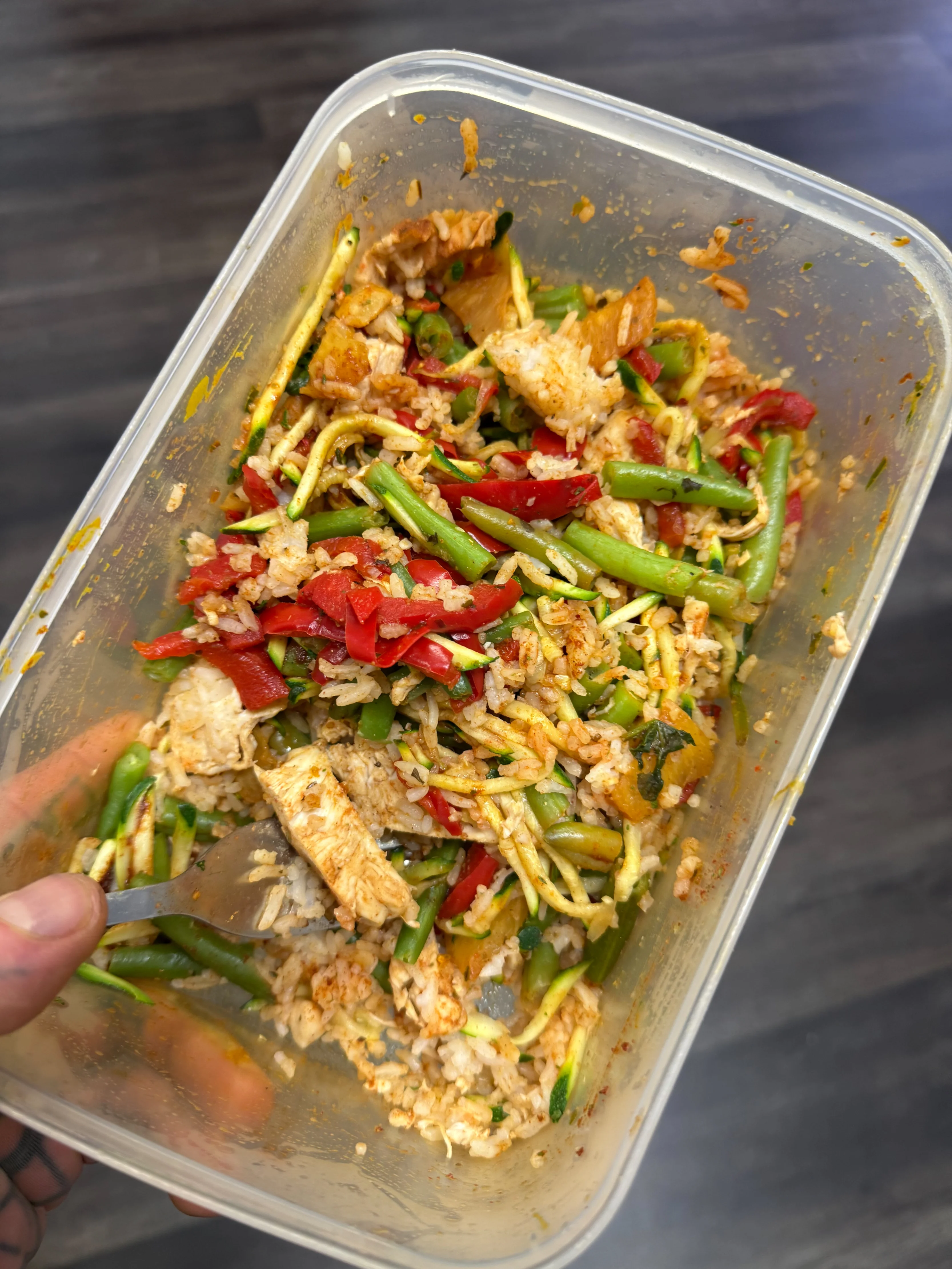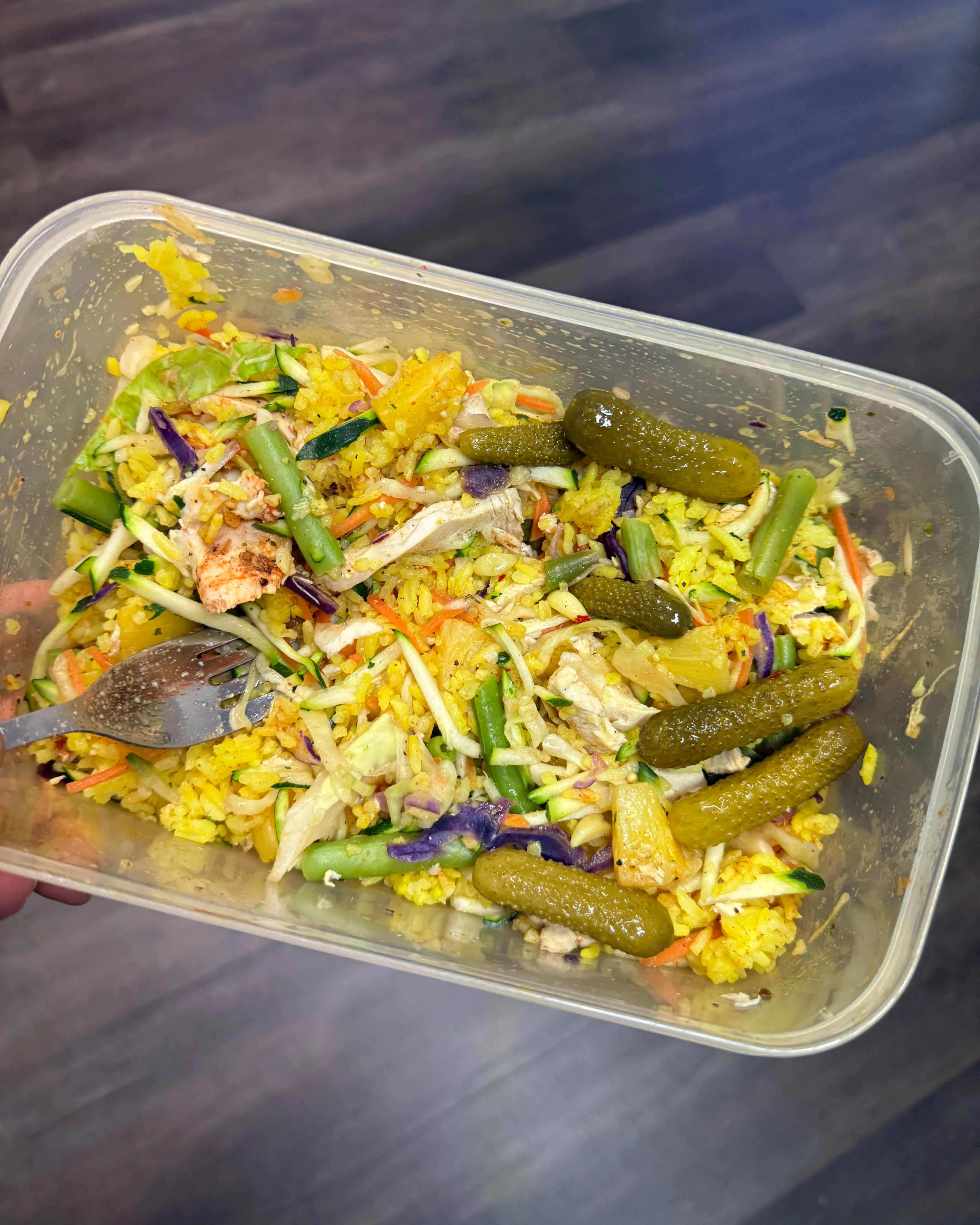 Breakfast this morning: chicken, rice, pineapple, micros, chilli