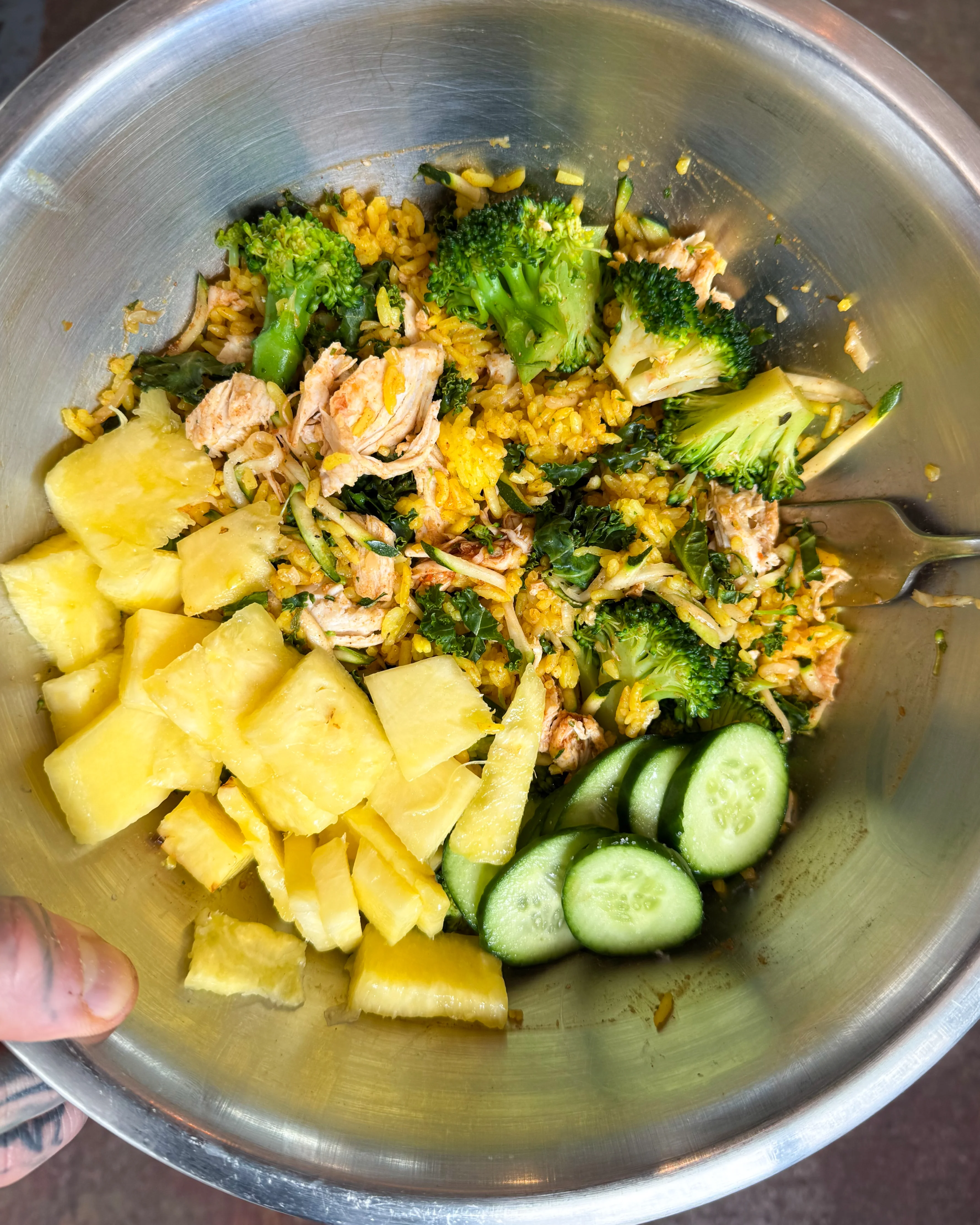 Chicken, rice, pineapple, kale, cucumber, chilli.