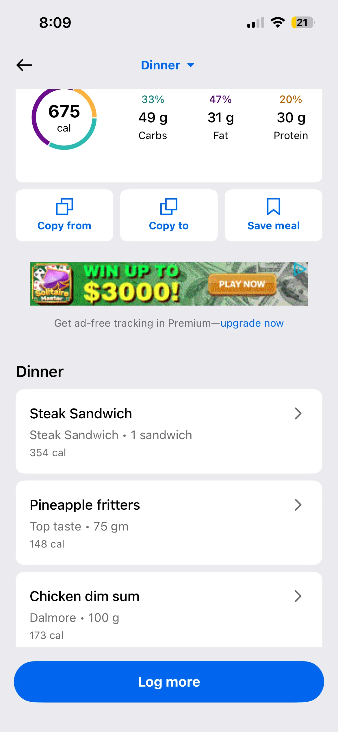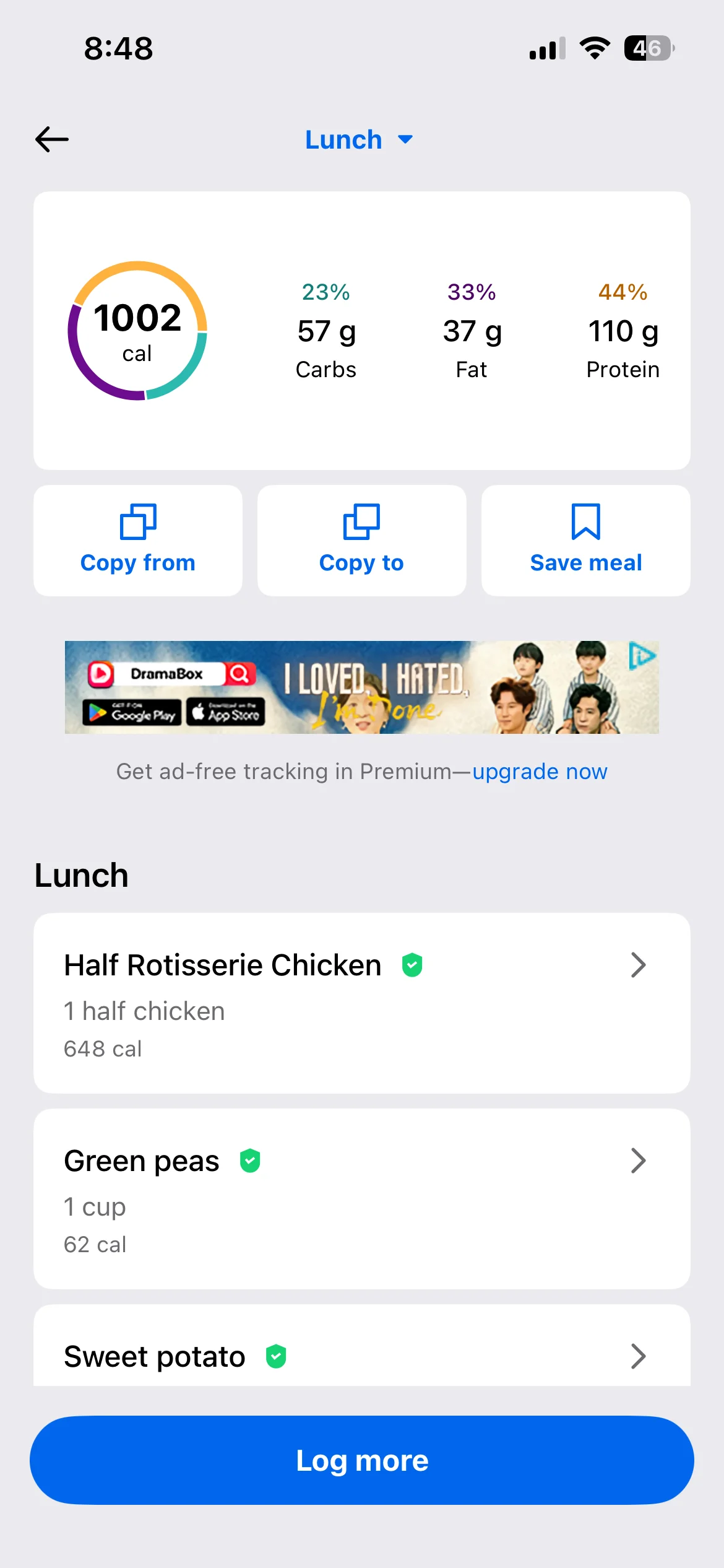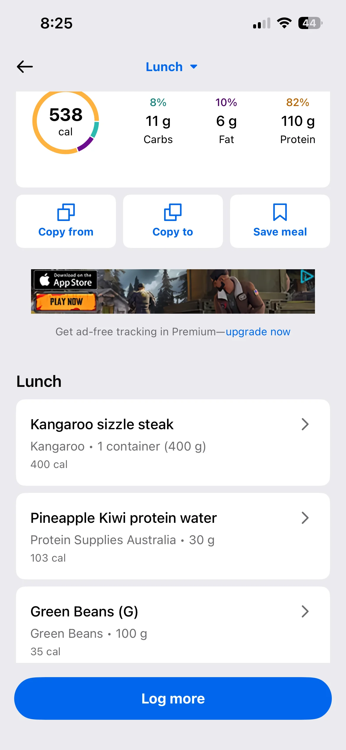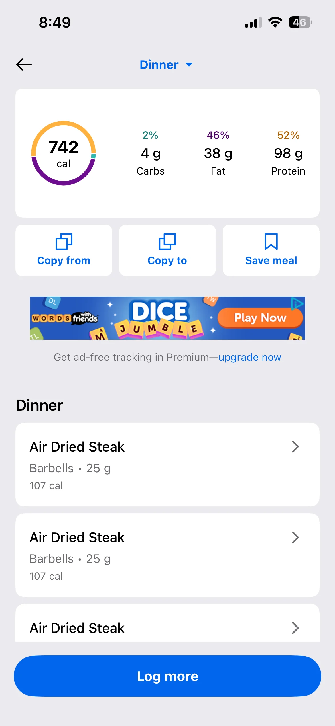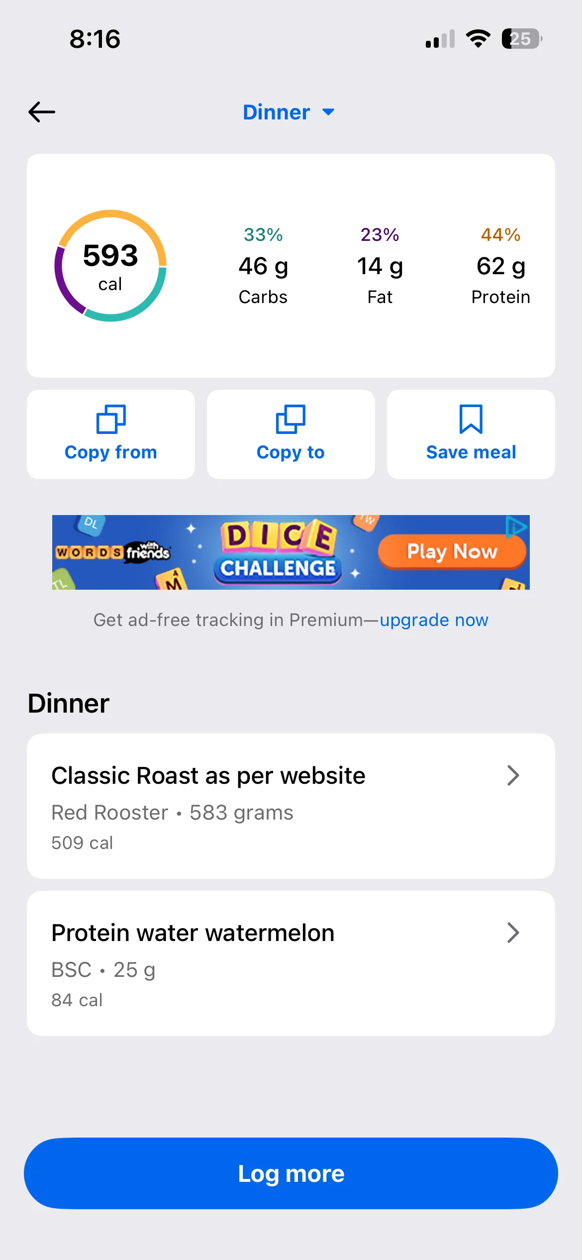 Honestly don’t even know what my lunch and dinner were they were both stews with different types meat and I have no idea to calculate the macros on it. I’d use an AI photo calorie tracker next time. To make it more accurate anyway i
